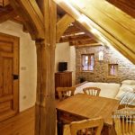 Chalupa Ledárna vypadá přesně tak, jak si asi krkonošskou roubenku představujete. Bílo-hnědé pruhování, masivní krovy, velký trojúhelníkový štít, podkrovní okna, kamenné zápraží… A uvnitř to vypadá úplně stejně. Chtěli byste si pospat za pecí jako pohádkový Honza, vyspat se v pohodlné posteli z masivního dřeva s výhledem do dřevěného trámoví nebo si jednoduše posedět na staré náspi a dívat se do krajiny? Chalupa Brusírna pro vás přesně tohle má a ještě mnohem víc. Inspirovala se historickou architekturou podkrkonoší, a přitom ji obohatila o množství cenných moderních akcentů.